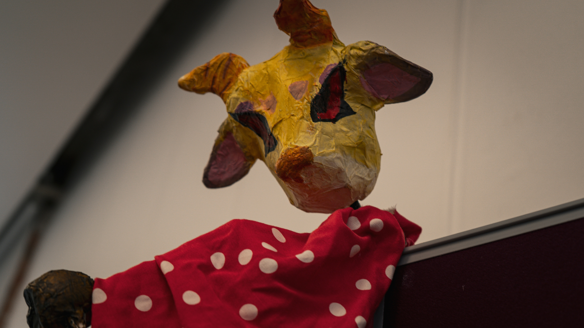 Puppet crafted by Face Off participant on display at Johnston Central Library.