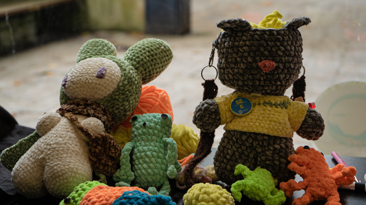 Crocheted animals made by Face Off participant on display in Johnston Central Library.